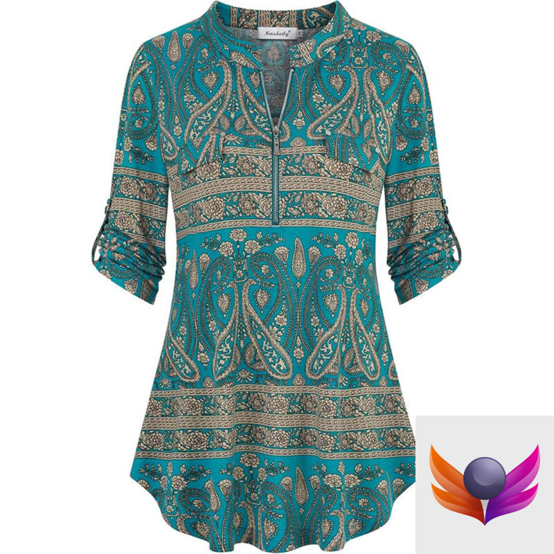 Women’s 3/4 Sleeve Plaid & Floral Zip Tunic Blouse – Casual Loose Fit Top